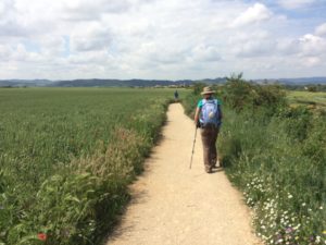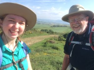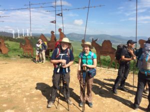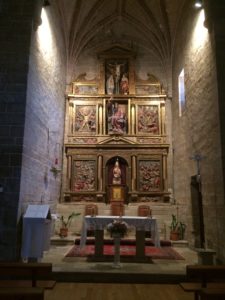 Today’s walk was the easiest so far – not easy by any means, but not as challenging as the previous days. We saw lots beautiful scenery, much of it wh eat fields about ready for harvest. The middle part of the day was a very steep climb to (and descent from) the top of Alto del Perdon, well over 300 meters. This is the site of the famous wrought iron sculpture of medieval pilgrims. On the way up we found a beautiful church, San Andres, in Zariquiegui. We’re talking a tiny church in a tiny village with the most amazing interior. I realized that today is the feast of Corpus Christy, one of my favorite feasts. I was able to find a time for quiet (and emotional) meditation. We are getting ready to find dinner with two young guys from New York (company for Isabella) and a middle aged woman who has bicycled alone all the way from Holland. One of the great things about the Camino is the people you meet.