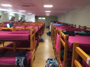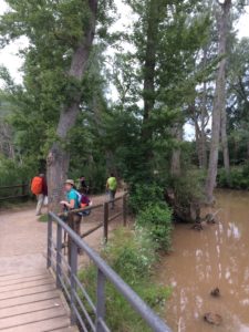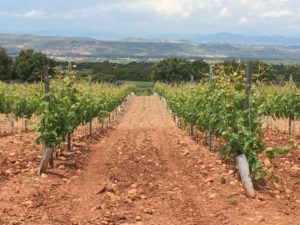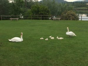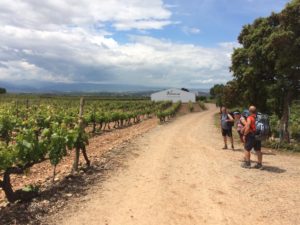 The first 9 or 10 km on our way out of Logroño was in what amounted to a beautiful park shared with pilgrims, walkers, runners, and bikers. We had breakfast at a café on a lake while a family of swans including 8 young lounged on the grass close to our outdoor table. Today was one of the longest planned stages of the entire pilgrimage with few sites or villages along the way. I ran out of energy several kilometers before our destination and, as usual, Isabella got her second wind and kept me going. We are still in wine country with acres and acres of vineyards. We have checked in at the municipal albergue which is a lot like what we figured would be typical – room for 90 pilgrims in one large room filled with bunks. The facility is nice, but very basic.
