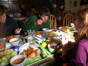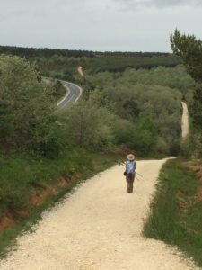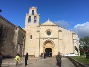 We got our earliest start yet, about 6:20, just before sunrise. We wanted the early start because we had a little further to go today and the terrain is quite a bit more challenging. The first half of our walk was through beautiful rolling farmland and forest. We stopped at Villafranca de Montes de Oca to pick up bocadillos (sandwiches) and refill our water bottles before starting the steep climb up 200 meters in elevation to Alto Mojapán, then 100 meters down past the Monumento de los Caídos, and back up 100 meters to Alto Pedraja before starting a gentle 100 meter descent to San Juan de Ortega. Our day started very cool, then even colder and breezy at the higher elevations. Then it started raining as we reached Alto Pedraja. The albergue at San Juan de Ortega was a welcome sight with the hope to get warm and dry. The San Juan church is one of the oldest we have seen so far. We had a great pilgrim mass followed by a communal pilgrim meal at the albergue that included the famous garlic soup that has been served here for many years.