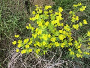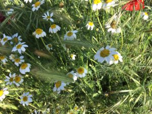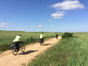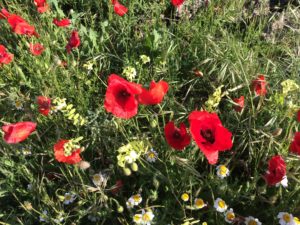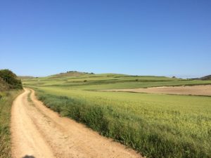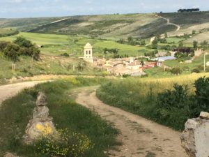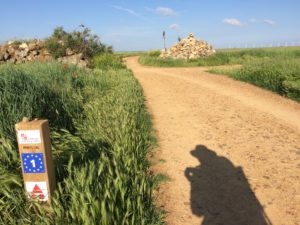 Today was our first full experience of the infamous meseta. As we had been told, there are long stretches of high plateau interspersed with narrow valleys, each with a small town with much appreciated bars offering a variety of food and drink. The guide book warned of lots of sun and heat with little shade – we got lots of sun, but kept our jacket and sweatshirt on because it was so cool and windy. There are still lots of rocks, now larger ones piled up along the edges of the fields and often covered with wildflowers. A few days ago when asked if we had seen any wildlife, I mentioned slugs (large), snails (small), and ants (large). I forgot to include that we are sometimes annoyed by what seem to be the Spanish cousins of Georgia gnats. (Sorry, no gnat photos.)