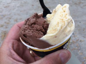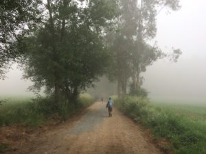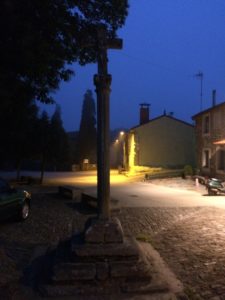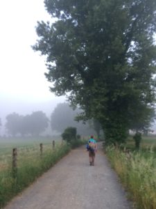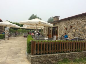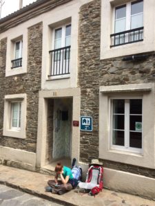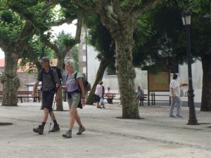 Because yesterday got uncomfortably hot, we decided to get a really early start today. It was early enough that we used our phone lights to see our way for the first little while. It was cool but extremely humid with heavy fog. We did not see a single other pilgrim until we stopped for our first breakfast six kilometers into our walk. The only sounds were the birds and the roosters. As with the last couple of days, we passed through a variety of wooded areas, small fields (many planted in corn), and small villages. The path, however, was hillier today with plenty of fairly steep ups and downs, plenty of work for the calves and knees. We enjoyed downtime in a central Arzúa park and still arrived at our albergue before they opened. Once we got in and settled, we had plenty of time for finding lunch, showering, doing laundry, resting, exploring, planning tomorrow’s walk, and choosing a place for dinner. And as is our custom in the larger towns, we capped off the evening with some delicious ice cream. It has turned out to be a much cooler day than yesterday, almost chilly.
